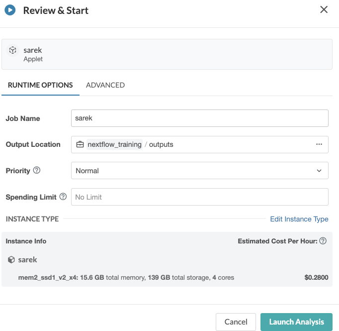 **Note! The estimated cost per hour is the cost to run the head node only! Each instance of the nextflow processes (subjobs) will have their own instances with their own costs.**