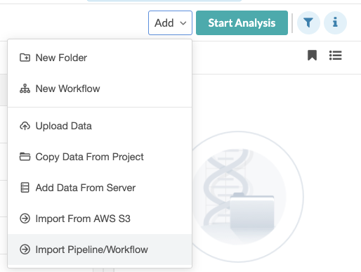 Go to a DNAnexus project. Click Add and in the drop down menu select 'Import Pipeline/Workflow'